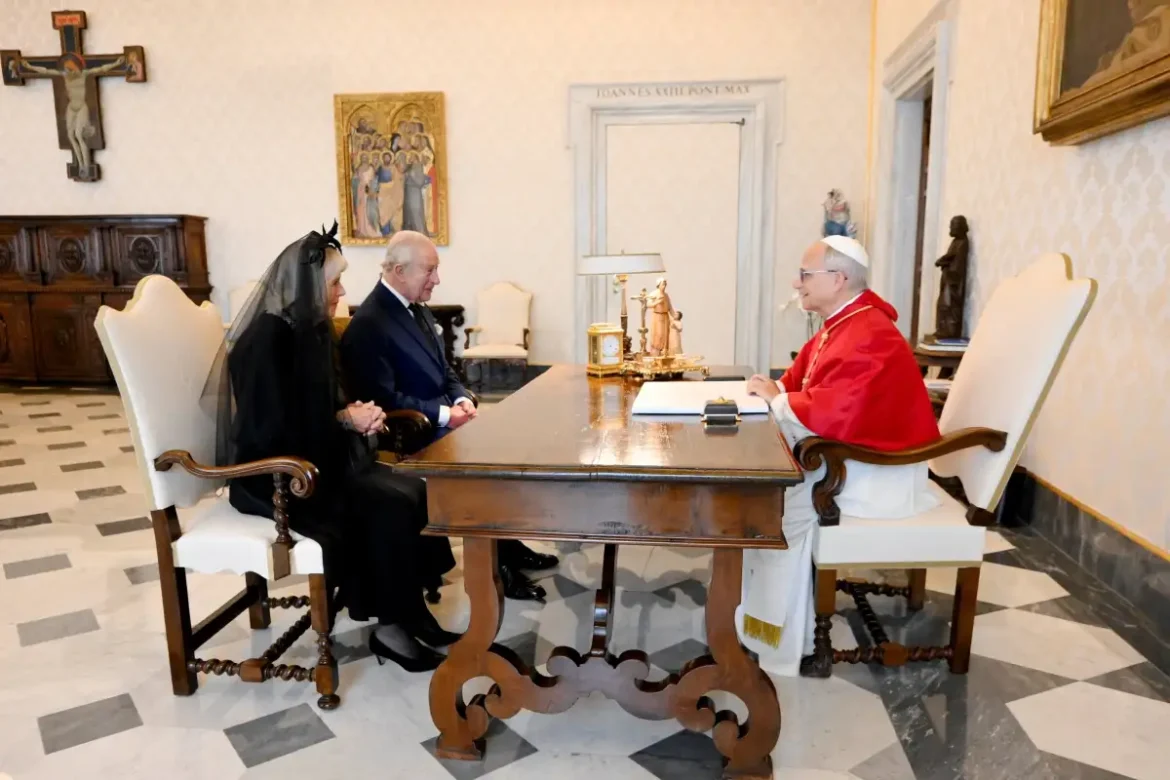 Ο βασιλιάς Κάρολος έγινε σήμερα (23.10.2025) ο πρώτος Βρετανός μονάρχης που μετά από 500 χρόνια προσευχθήκε δημόσια με έναν Πάπα. Συνοδευόμενος από την βασίλισσα Καμίλα και υπό τους ήχους του βρετανικού εθνικού ύμνου, το βασιλικό ζεύγος έφτασε στην επίσημη κατοικία του Πάπα Λέοντα, στο Αποστολικό Παλάτι, στο Βατικανό.